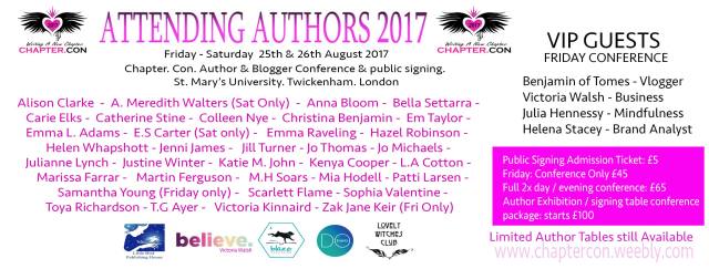 Finally, the biggest news I have to share is that I’ll be attending Chapter Con 2017 at the end of August (25th-26th) in Teddington, London. What does that mean? During this two-day event I’ll be talking on one of the five panels set up, whilst also having a table with my books to sell and swag to give away with a ton of other awesome authors from around the globe. Come meet me, ask me anything, take some selfies. For some more in-depth information, click here.